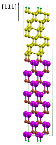 Slab model of the diamond–GaN heterostructure with the abrupt N-C interface type in the [111] growth direction. Large violet and small brown balls represent Ga and N atoms, correspondingly. Small yellow balls and tiny green balls represent C atoms and terminating H pseudoatoms, respectively.