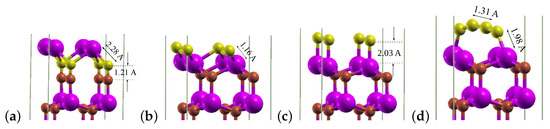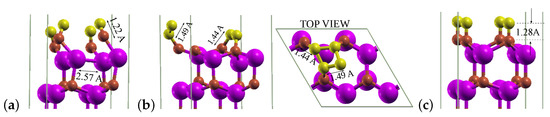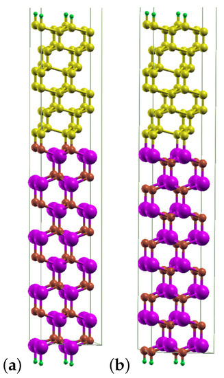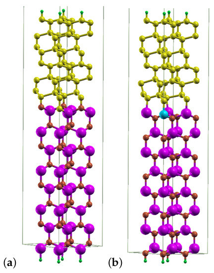 Next, and substitutional dopants were introduced into the interface lateral unit cell of the GaN substrate according to the reconstruction patterns and predicted in Section 4.1. The structures of the relaxed, reconstructed heterointerfaces are shown in Figure 14a,b. Both reconstructions changed the length of the interface bonds. In the case of the reconstructed N-C interface type, the C–C bond length was 1.52 Å and three other N–C bonds possessed an average length of 1.48 Å. In the case of the Ga-C interface type, the Si–C bond length was 1.86 Å, and the average Ga–C bond length was 1.99 Å.