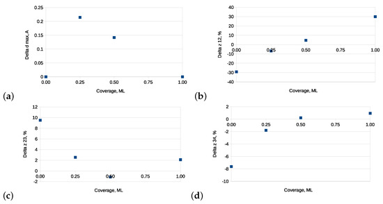 As can be seen, with the increasing carbon coverage, the adsorption energies became less negative, which presented a typical behavior caused by the enhanced interaction between the adsorbates. Moreover, the adsorption energies of the C atom on the GaN surface were about 2 eV/atom larger (more negative) as compared to those of GaN, what indicated that the deposition process of carbon took place preferentially on GaN. Moreover, the only adsorption site enabling the formation of a single carbon monolayer on the GaN surface was the on top one. Hence, it was reasonable to analyze here an influence of the adsorption process on the GaN’s substrate morphology. Figure 9a displays the buckling of the topmost nitrogen monolayer, established for the on top adsorption site of carbon. As a measure of buckling, we assumed here the maximal difference between the z-th positions of the topmost nitrogen atoms expressed in Å. As can be traced from Figure 9a, the buckling varied with coverage, assuming a maximal value for 0.25 ML. When the GaN surface was completely covered with carbon adsorbates, the buckling vanished, which corroborated the presence of a flat pre-adsorbed carbon monolayer. The adsorption process additionally changed the atomic structure of the GaN substrate. This can be observed in the plots of the interlayer distance difference of the three topmost GaN layers presented in Figure 9b,c. denotes a difference in spacing between the i-th and j-th substrate’s layer with respect to that of the clean surface before relaxation. The values of changed roughly linearly as the coverage increased, and the tendency of reducing the effect of relaxation could be additionally observed for the second and third interlayer spacing (, ). In the case of the first interlayer spacing , changes induced by carbon adsorption reached up to for the full coverage.