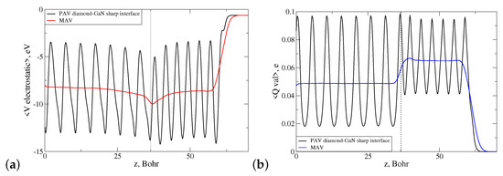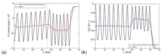 Both interface types were influenced by an internal electric field arising due to the presence of spontaneous and piezoelectric polarization in the wz-GaN material. Due to the different substrate polarities, these fields had opposite directions in both structures. Moreover, due to the different valencies of the species at the interface, long N-C and Ga-C bonds were oversaturated and undersaturated with electrons, respectively. This means that there was a portion of uncompensated electron charge present in the lateral cell of each interface as a monopole. These two factors influenced the overall energetic stability of the discussed diamond–GaN interface. To investigate this issue, a profile of the electrostatic potential was computed as a function of the heterostructure height z for both heterostructures, and next, its macroscopic average in-plane was found, as well. Figure 11a presents the course of both functions denoted as PAV and MAV for the abrupt N-C interface type. The function exhibited a negative slope in the range Bohr, which corresponded to the height of the GaN substrate. This behavior indicated the presence of a nonzero electric field present in the system. As can be observed in Figure 11a, this field penetrated the diamond part of the heterostructure for Bohr, which manifested itself by the increasing, positive slope of the macroscopically averaged function denoted by red color (MAV). It should be noted here that in present calculation, a slab dipole correction was used to compensate the electric field in the vacuum area caused by the dipole moment of the system [40].