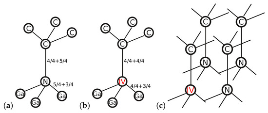 All three technologies of GaN-on-diamond fabrication presented in the Introduction require the creation of bonding between species of different valencies. In the case of the abrupt N-C diamond–GaN interface type presented in Figure 10a, the corresponding tetrahedral configuration in the vicinity of long interface bonds is depicted schematically in Figure 13a.