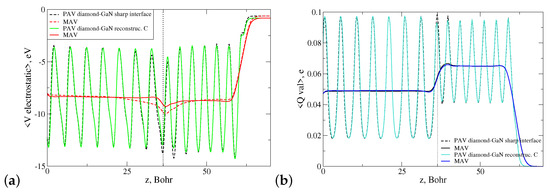 Course of laterally (PAV) and macroscopically (MAV) averaged profiles of the (a) electrostatic potential and (b) valence electron charge density in the diamond–GaN heterostructure with the Ga-C abrupt and reconstructed interface types. The applied reconstruction pattern is . A dotted line points to the average z-th position of the topmost Ga atoms.