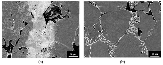 The distributions of low-angle grain boundaries (angle < 10°) marked by the solid red lines are displayed in Figure 7e. Some boundaries between the pores and the areas identified as BCC/BCT structure were also marked by the dashed black lines in Figure 7e. The results show that numerous low-angle grain boundaries existed inside the acicular structure with a lower image quality. The image quality map in EBSD reflects the crystal perfection in the analyzed areas [18]. Defects in the crystal structure, such as dislocations or grain boundaries, impair the intensity of Kikuchi patterns and thus degrade the brightness of the image quality map in EBSD. In an Fe-based alloy, martensite contains numerous crystal defects, including dislocations, twin boundaries, and lath boundaries [19]. Because the defect concentration of martensite is obviously higher than that of ferrite, the image quality of the martensite was inferior to that of ferrite [17,20]. Thus, the coarse grains with superior image quality/lower microhardness and the acicular structure with inferior image quality/higher microhardness were ferrite and martensite, respectively.