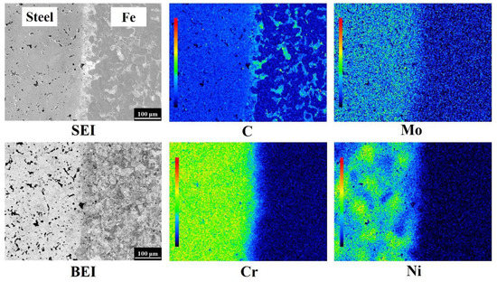 The elemental distributions of the Fe-4Ni-3Cr-0.5Mo-0.5C/Fe LMC were analyzed by EPMA and are shown in Figure 4. Cr, Mo, and C were homogeneously distributed in the Fe-4Ni-3Cr-0.5Mo-0.5C layer, but Ni was not uniformly distributed because elemental Ni powder was used [17]. Furthermore, after 1250 °C sintering, the C in the Fe-4Ni-3Cr-0.5Mo-0.5C layer had obviously diffused into the Fe layer, resulting in the formation of pearlite in the Fe layer.