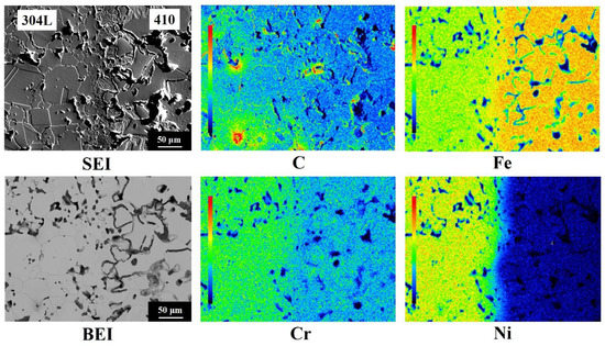 The EPMA elemental distributions at the interface of the 410/304L LMC are shown in Figure 6. The color bar in the left part of each elemental mapping represents the relative levels of atomic concentrations, and the red and the black colors indicate the highest and lowest atomic concentrations, respectively. Because the nominal compositions of the 304L and 410 layers were Fe-18.5Cr-11.3Ni and Fe-12.5Cr-0.4C, respectively, the Cr and Ni contents in the 304L layer should have been higher than those in the 410 layer. Conversely, the Fe and C concentrations in the 410 layer should have been higher than those in the 304L layer. As expected, the EPMA elemental mappings in Figure 6 demonstrate that the 304L layer was rich in Cr and Ni, and the 410 layer was rich in Fe. Before sintering, the C concentration of the 410 layer was higher than that of the 304L layer. Surprisingly, the C mapping in Figure 6 showed that, after sintering, the color levels in the 304L and 410 layers were mostly green and blue, respectively, indicating that the C content of the 304L layer was higher than that of the 410 layer. This phenomenon could be attributed to the difference in the chemical potential of C in the two layers. Wu et al. [17] used thermodynamic simulation to simulate the effects of Cr, Ni, and Mo on the chemical potentials of Fe-X-0.5C at 1120 °C. According to the thermodynamic simulation results, 1 wt % Cr could reduce the chemical potential of C by 1.08 kJ/mol, and 1 wt % nickel could increase the chemical potential of C by 0.44 kJ/mol. Since the Cr and Ni contents of the 304L layer were, respectively, 6 wt % and 11.3 wt % higher than those of the 410 layer, the chemical potential of C was lower in the 304L layer than in the 410 layer. This phenomenon led to the diffusion of C from the 410 layer into the 304L layer during sintering and the formation of a low C area near the interface of the 410 layer.