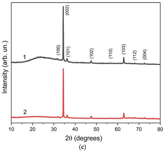 The morphology of the synthesized ZnO samples depends on a number of growth process parameters, such as the temperature and concentration of the growth solution, and the synthesis duration. In particular, the layers of ZnO nanorod arrays were obtained at a low solution concentration (15 mM) at a synthesis temperature of 90 °C and synthesis time of 1 h (Figure 1a), and the ZnO films were synthesized at a concentration of 200 mM under the same conditions (Figure 1b).