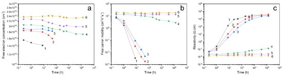 Concentration (a), mobility (b) and resistivity (c) of ZnO films: P-sample (1) and A + P samples annealed in air for 30 min at a temperature of 100 °C (2), 175 °C (3), 250 °C (4), 325 °C (5) and 400 °C (6) followed by treatment in hydrogen plasma for 3 min versus aging time.
