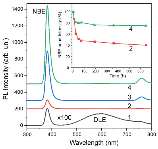 Room-temperature PL spectra of the as-grown ZnO (1), P-sample (2) and A + P samples preliminary annealed at 250 °C (3) or 400 °C (4) in air followed by H-treatment. Inset: dependence of the normalized NBE intensity for P-sample (2) and A + P sample (4) versus aging time.