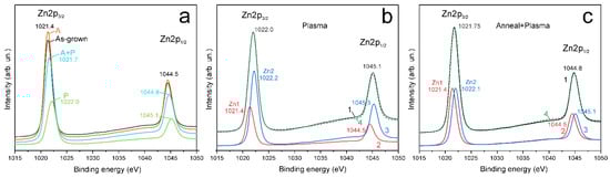 In what follows, the spectrum that is completely equivalent to the spectrum of the AG sample in terms of the shape, position, and full width at half maximum (FWHM) of the lines, but with a normalized intensity, will be denoted as Zn1. As can be seen from Figure 4a and Table 1, the position and FWHM of the Zn2p3/2 and Zn2p1/2 peaks in the A-sample are the same as in the AG-sample, although the XPS spectrum intensity increases slightly after annealing.