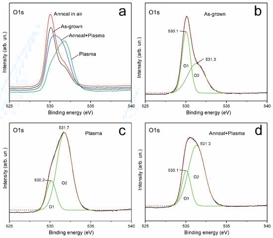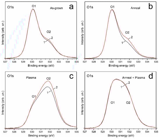 XPS O1s core level lines: the XPS O1s spectrum of the as-grown sample (Figure 5) is typical of ZnO grown by the CBD method and exhibits asymmetry, which indicates the presence of several forms of oxygen bonds in the ZnO near surface region. The XPS O1s spectra of all four samples can be deconvoluted into at least two peaks—O1 and O2 (Figure 5). Table 2 shows the position, FWHM, and relative contributions of the component peaks. The O1s peak with a maximum at ~530 eV (designated as the O1 peak) corresponds to O2‒ ions in the ZnO wurtzite structure. XPS O1s components with a higher binding energy of ~531.5 eV (designated as the O2 peak) correspond to O2‒ ions with a lower valence electron density and can be attributed to hydroxyls bonds, i.e., HO–ZnO, as well as to O2‒ ions in oxygen-deficient regions in the ZnO matrix [33].