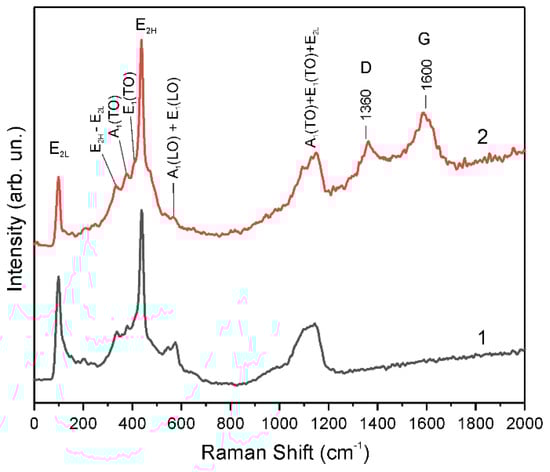 Raman spectra of two ZnO films simultaneously treated in hydrogen plasma for 3 min: (1) P-sample, (2) A + P sample.