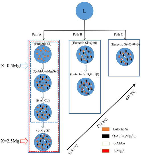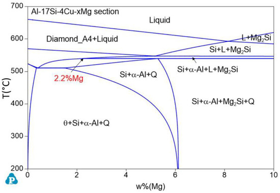 - According to the DSC solidification curve and solidification phase diagram, during solidification, the hypereutectic Al−17Si−4Cu−xMg alloy mainly follows the path: L → α-Al + eutectic Si + Q phase + θ phase with Mg content < 2.2 wt.%, and L → α-Al + eutectic Si + Q phase + θ phase + β phase with Mg content > 2.2 wt.%.