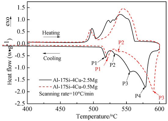 Figure 3 presents the DSC curves of the hypereutectic Al−17Si−4Cu−0.5Mg and Al−17Si−4Cu−2.5Mg alloys subjected to semisolid extrusion. The DSC analysis was conducted to identify the solidification behavior. Table 2 presents temperatures associated with all peaks present in the DSC curve. The DSC results showed that liquidus and eutectic temperatures decreased as Mg level increased. There were three peaks in the Al−17Si−4Cu−0.5Mg alloy and four peaks in the Al−17Si−4Cu−2.5Mg alloy, marked as P1, P2, P3, and P4. Figure 4 shows the solidification path of the two alloys. From the DSC curve and solidification path, the solidification behavior of the two alloys can be obtained. According to DSC solidification curve and solidification path diagram, the alloy solidification path can be seen as follows: first, α-Al is formed, followed by the Al−Si eutectic. When the temperature further decreases, Q phase is formed by the ternary eutectic reaction via the rest liquid reaching its composition; in this regard, Q phase is distributed surrounding the eutectic Si, and excessive Cu transforms into the Al2Cu phase. However, for the hypereutectic Al−Si−Cu−Mg alloy that contained a high Mg amount, in addition to Q-phase formation, the remaining Mg combines with Si. Mg2Si forms after the Al−Si eutectic reaction. Therefore, for the Al−17Si−4Cu−0.5Mg alloy, three peaks P1, P2, and P3 correspond to Al2Cu phase, Q phase, and eutectic Si phase and α-Al, respectively. For the Al−17Si−4Cu−2.5Mg alloy, the additional peak P4 corresponds to the Mg2Si phase. Solidification temperature decreases with an increase in the Mg content.