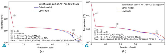 Solidification path of the Al–17Si–4Cu–xMg alloy with temperature in Al–17Si–4Cu alloy solidification containing (a) 0.5 Mg and (b) 2.5 Mg.