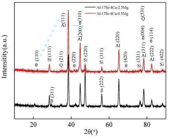 Figure 6 presents the XRD curves of the hypereutectic Al−17Si−4Cu−0.5Mg and Al−17Si−4Cu−2.5Mg alloys obtained during semisolid extrusion formation. The XRD curves reveal that the peak positions of the basic second phases in the two alloys are the same. The diffraction peak intensity of the Q phase shows an increasing trend, as with the Mg level. In an XRD curve, a hypereutectic Al−Si−Cu−Mg alloy with a higher Mg content shows one additional peak corresponding to the Mg2Si phase than that with a lower Mg content.