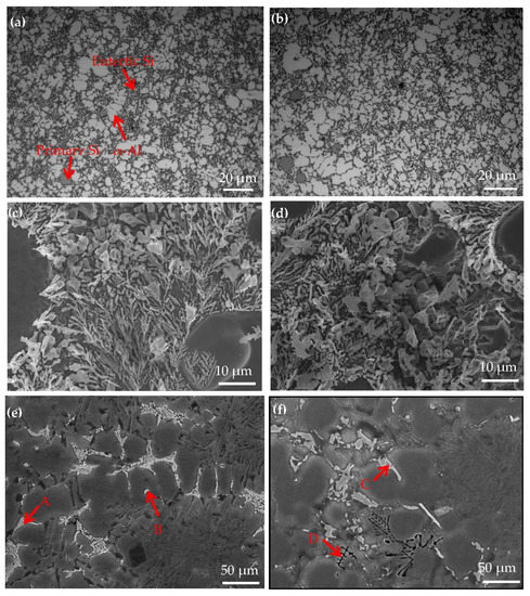 Hypereutectic Al–Si alloys have been extensively utilized in the automotive industry for manufacturing large and complex castings, such as engine cylinder heads, engine blocks, or gearbox housings, because of the desirable integration of their favorable casting, cost-effectiveness, and corrosion resistance [1,2,3,4]. Si is almost insoluble in the matrix; only eutectic or primary Si can be formed in the matrix. Si phases are highly brittle, which causes a decrease in the strength of aluminum alloys. Thus, Al−Si alloys have less desirable mechanical performances. For enhancing Al−Si alloys’ mechanical performances, an appropriate amount of alloy elements will usually be added to the alloy and a reasonable heat treatment process will be adopted. Cu is the most common alloy element added in an Al−Si alloy, Cu is added to form θ-Al2Cu and other phases in the alloy and then, through ageing and strengthening of these phases, alloy properties are improved [5,6].