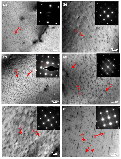 Figure 9b,d,f shows TEM structure for the Al−17Si−4Cu−2.5Mg alloy at different ageing times. The precipitate size in the alloy with higher Mg (2.5 wt.%) is larger than that in the alloy with lower Mg (0.5 wt.%). In peak ageing, numerous needle-like phases were observed in the crystal. According to the cross-star awn in the diffraction spots in Figure 9d, the precipitate exhibited the metastable strengthening phase β″ [25,26,27]. The β″ phase mainly precipitated along the [001]Al direction. The TEM image indicates that the β″ precipitates, in this direction, exhibit needle-like and spherical morphologies. In the over-ageing stage, thin plate θ′ precipitates were associated with planes {001} (Figure 9f). In the SADP pattern (inset off Figure 9f), its streaking down the 002 systematic rows conforms to thin precipitates. Alongside this, the precipitates with θ′-Al2Cu plate shape showed a representative orientation relation to the aluminum matrix (001)θ′∥(001)Al and [100]θ′∥ [100]Al [14,24].