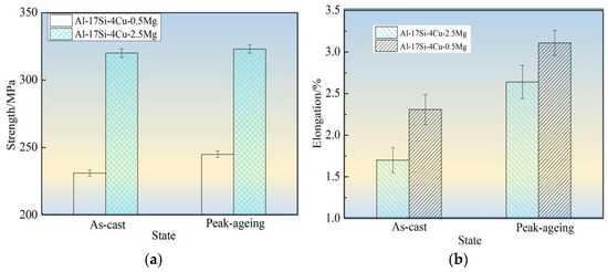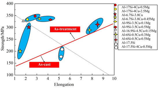 Figure 11 compares mechanical performances between our as-cast and other alloys [8,9,19,31,32]. In a certain range, the increase in Mg content can substantially improve the alloy strength (Figure 11). In this experiment, for the Al−17Si−4Cu−0.5Mg alloy, its elongation and tensile strength reached 3.11% and 331 MPa, respectively, and those of the Al−17Si−4Cu−2.5Mg alloy attained 323 MPa and 2.61%, respectively, after the T6 thermal treatment. Our studied alloys have increased strength compared with most Al−Si alloys, mainly because of the adoption of semisolid extrusion which substantially refines the alloy microstructure.