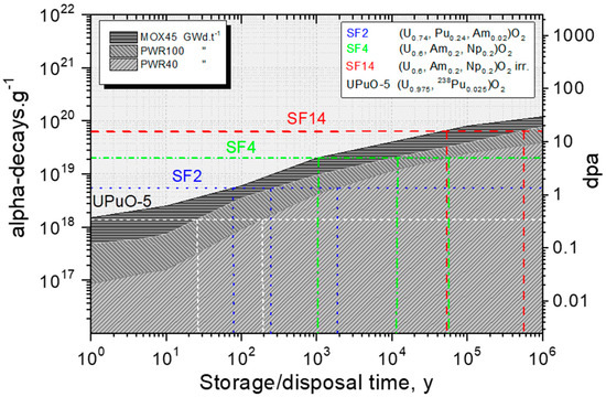 Evolution of the alpha dose and damage (expressed as dpa) in three types of fuels: PWR fuel with 40 GWd.t−1, high burnup PWR fuel with 100 GWd.t−1HM, and MOX with 45 GWd.t−1. The figure also shows the equivalent doses/damage of four of the samples of this study that will be discussed in more detail in the Materials and Methods section.