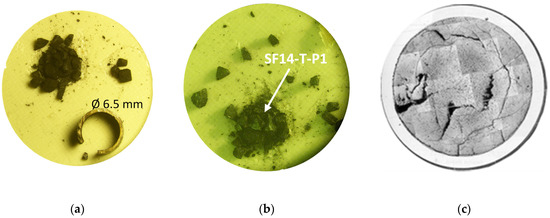 (a,b) Optical image of de-cladded fuel and the fragment used (SF14-T-P1) in the reported analyses pointed by an arrow, and (c) ceramography of a section of the same rodlet.