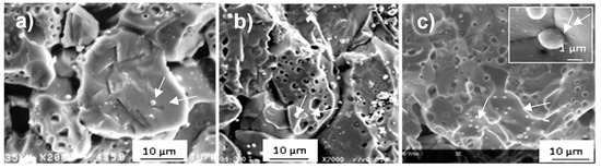The small spherical precipitates that can be observed in the three images in Figure 4 (indicated by arrows), highlighted in the inset of Figure 4c, are the typical noble metal (Mo, Tc, Ru, Pd, Rh) fission product precipitates formed during irradiation. Their size, on average close to 1 µm, derives from the high irradiation temperature [33], as was also observed in LWR fuels irradiated at high temperature (see, for example, [34]).