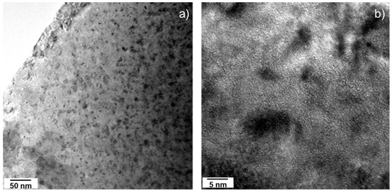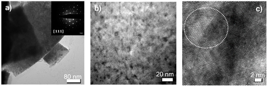 In this archive sample, with initially 20 at% Am and 20 at% Np, the accumulated damage consisted of dislocation loops and some small dislocation line segments, as can be seen in Figure 6a,b. The size of the loops is larger than in the SF2 samples, while their concentration appears slightly lower. Figure 6c shows, for example, an image in high resolution of a loop with a diameter of 5 nm. The total damage of almost 5 dpa was substantial, and nanometric bubbles are also observed (white dots on Figure 6b).