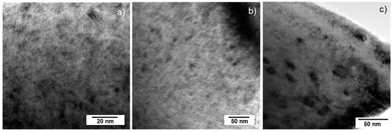 In this sample, which was examined 450 days after production and had cumulated approximately 0.34 dpa, microstructure analysis revealed the presence of dislocation loops with sizes between 3 and 7 nm, and in some cases as large as 20 nm, as shown in Figure 8a–c and as also recently partly reported in [18]. Some further properties (thermal diffusivity, lattice parameter) were measured and reported for this sample recently [14,18]. It could be shown that the microstructure was evolving from an early formation of dislocation loops to larger dislocation loops, reducing in density with increasing dose. The equivalent storage time of a standard LWR fuel would be around 200 years for this sample at the time of this study (see Table 1).