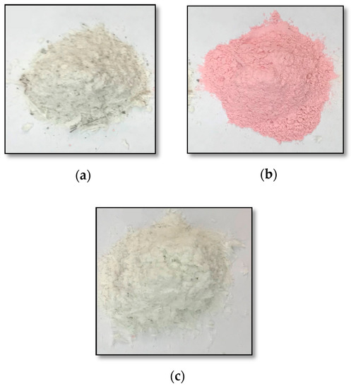 In this study, an attempt was made to produce geopolymers using three different waste fractions from wind turbine rotors (Geopolymer Building Eko, Żagań, Poland). Conventional class F fly ash was obtained from the Skawina Heat and Power Plant (Skawina, Poland) and river sand (ZODIAK, Świętochłowice, Poland). Figure 1 shows a subset of the different waste fractions: materials I, II and III. The waste fraction I shown in Figure 1a is white-gray in color. It contains visible fibers and powder particles. The fibers are clumped into elongated pieces and flakes ranging from a few millimeters to a few centimeters in length. In addition, small gray particles are present, which are usually between 0.5 mm and 3 mm in size. This fraction is derived from the aerodynamic part of the rotor blade. The waste fraction II marked in Figure 1b is pink in color. It is in the form of a fine powder with no distinct fibers in its composition. This fraction is derived from the monolithic part of the turbine blade, which is used to fix the whole blade component. The waste fraction III marked in Figure 1c is white in color. It contains fibers and powder particles. The fibers are joined together to form elongated pieces and flakes ranging from a few millimeters to a few centimeters in length. This waste is derived from the aerodynamic part of the rotor blade. Materials I and III differ only in the degree of fragmentation. Material I is smaller, more fragmented and homogeneous. Material 3 shows fragments of laminates (resin-bonded fibers) in the form of tiles, etc.