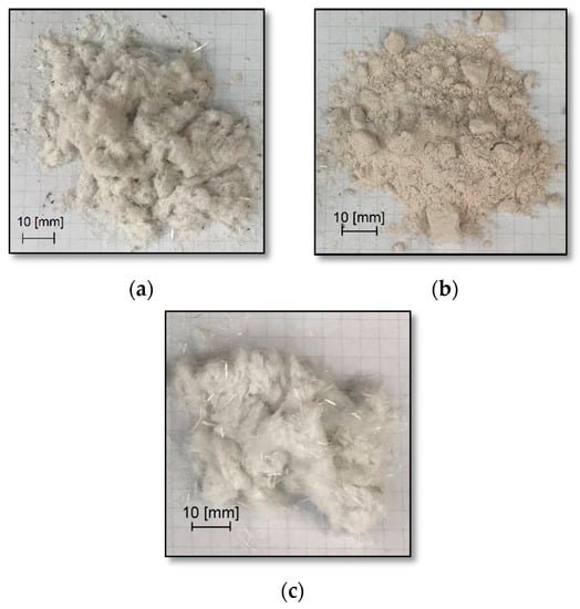 Figure 2a–c show the fractions of the waste material from the windmill turbines after the completion of the firing process of the organic parts in the chamotte furnace. The burning was carried out at 600 °C for 12 h. These materials changed their color under the influence of temperature. The fibers, which were less visible in the unburned material, also became visible. Table 2 shows a summary of the results obtained during the above test. The inorganic fiber content is highest for fraction I (72.35%) and fraction III (70.88%). Fraction II was characterized by a lower content of the inorganic part, which was 56.89%. This means that it contained the lowest proportion of the reinforcement of all three fractions of the windmill turbine waste. The weight loss of the samples is not only a result of disposing of combustible organic parts, but also due to some effects appearing from moisture (but this is of secondary importance). The samples were stored under the same conditions, and possible mass loss effects due to moisture should be the same for the three tested waste fractions.