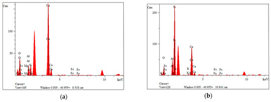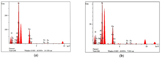 Figure 3 shows the morphology of waste material number I, a composite additive in the tested geopolymer materials based on fly ash and river sand. The composite was characterized by the presence of fibers whose length oscillated between 50 µm and 1000 µm. The fibers were glued together in small agglomerates or separately. Fine particles could be seen on the surface of the fibers. These are most likely the residue of the polymer matrix. This waste fraction also contained small particles that were less than 50 µm in size, which may have arisen from fiber fragments or crushed parts of the polymer matrix. Figure 4a,b show the measured spectra, recorded with the EDS system, on the basis of which, it was possible to qualitatively determine the chemical composition of the tested material. Fraction I showed the presence of elements such as oxygen, aluminum, magnesium, calcium, silicon and iron.