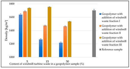 The density of geopolymer materials based on fly ash and sand, with the addition of waste fractions from windmill turbines, was calculated using the geometric method. The average values for each type of geopolymer are shown in Figure 9. The samples with the addition of the waste fraction tended to decrease in density as the proportion of the filler phase increased. In each series, samples with the addition of waste fraction I had the lowest density and samples with the addition of waste fraction III had the highest density. Composite II in each series had a density between waste fraction I and waste fraction III. The largest differences in density were seen for the waste fraction contribution of 15%, where the discrepancy between samples was over 400 kg/m3, and for the waste fraction contribution of 30%, where the discrepancy was approximately 300 kg/m3. Densities in the vicinity of the reference sample were obtained for composite III with fraction contents of 5% and 15%. The lowest density was obtained with the addition of the 15% and 30% fraction of composite I. It was 1266 kg/m3 and 1217 kg/m3, respectively, where, in comparison, the reference sample had a density of 1701 kg/m3. The lowest increase in density, compared to the reference sample, was observed in the sample with fraction II at a 30% addition to the geopolymer.