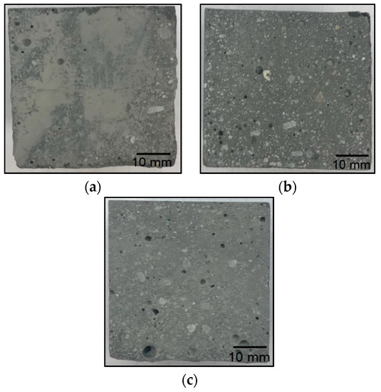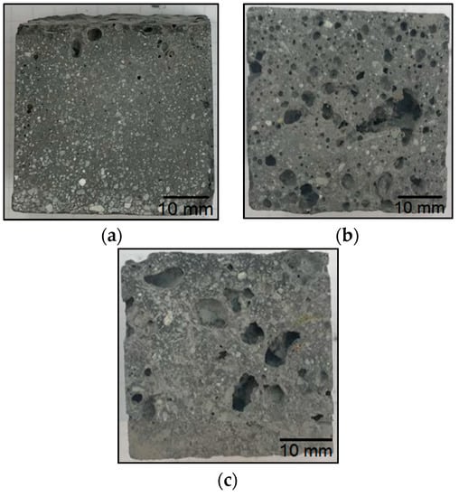 The geopolymer composite with waste fraction I was characterized by the worst strength properties and the highest porosity, which can be seen in Figure 12. Ultramacropores with diameter above 10 mm are very unfavorable. They have a very unfavorable influence on the strength properties. They are probably caused by the reaction of alkaline solutions with resin waste by the evolution of gases or by a significant aeration of the mixture during the manufacturing process. Although all samples were compacted, some reactions may have taken place in the material during curing, and it was not possible to completely remove these pores. It should be noted that this phenomenon is not accidental because, during numerous trials and repetitions, a very porous structure was obtained for the material with waste I each time.