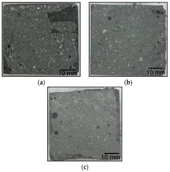 Breakthroughs of geopolymer samples based on fly ash and river sand with the addition of fraction II from a windmill turbine: (a) 5% fraction addition; (b) 15% fraction addition; (c) 30% fraction addition.