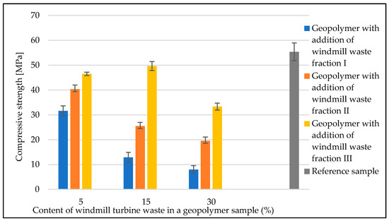 Figure 15 shows a summary of the average compression test results for the geopolymer samples based on fly ash and sand with the addition of the windmill turbine waste fraction. The average value for the reference sample was 55.4 MPa. The compressive strength of the materials with the addition of waste fractions was lower than that of the reference sample. The materials with waste fraction I and II showed a decrease in strength with an increasing filler amount. The material with waste fraction I in an amount of 5%, 15% and 30% showed the lowest strength in comparison to the other geopolymer materials, for which, the values were, respectively, 31.6 MPa (for 5% addition), 12.8 MPa (for 15% addition) and 8.0 MPa (for 30% addition).