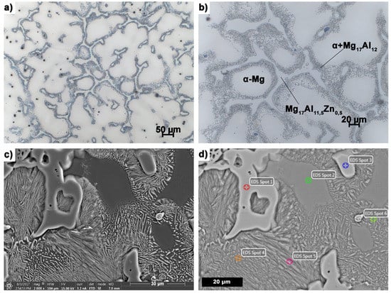 Microstructure of AZ91 (MgAl9Zn1) sand casting magnesium alloy recorded with (a,b) optical microscope, (c,d) SEM.