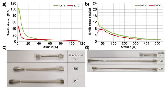 Representative tensile curves at 300 °C and 350 °C magnesium sand casting AZ91 (MgAl9Zn1) extruded using (a) the conventional method with the processing degree λ = 45 and ε = 10−4 s−1 (b) the KOBO method with the processing degree λ = 44.4 and the die rotation frequency f = 6 Hz. A photo after a static tensile test of representative samples extruded using the method (c) conventional, (d) KOBO.