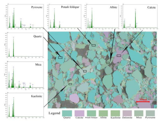 The sample was scanned with a JSM-6390A scanning electron microscope at a magnification of 500 times. After scanning, an energy spectrum base map and a surface scanning image of seven elements Si, Al, Ca, K, Fe, Mg, and Na were obtained; 320 images (including 40 base map and 280 EDS photo for 7 different elements) were obtained for each sample (Figure 1). Corresponding colors fell respectively into seven different elements, and then these seven different colors were added to the base map according to the RGB values [20], as shown in Figure 1.