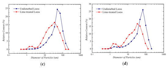 From the whole mineral particle size distribution curves, compared with undisturbed loess, the particle size of all mineral particles in lime-treated loess decreased. This is consistent with the decrease of mineral particles in lime-treated loess observed directly above.