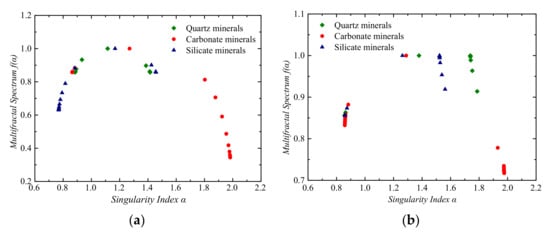 The multifractal singular spectrum of PSD of three different minerals in undisturbed loess and lime-treated loess is shown in Figure 7. The functions of PSD of the three mineral particles in the two soils are convex functions, indicating that different mineral particles showed non-uniformity.
