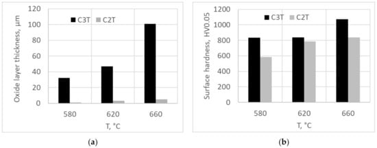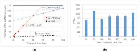 Surface layer (a) thickness of C3TPdAg660 and C2T660 samples and (b) hardness of C3TPdAg samples treated at 660 °C for different time periods.