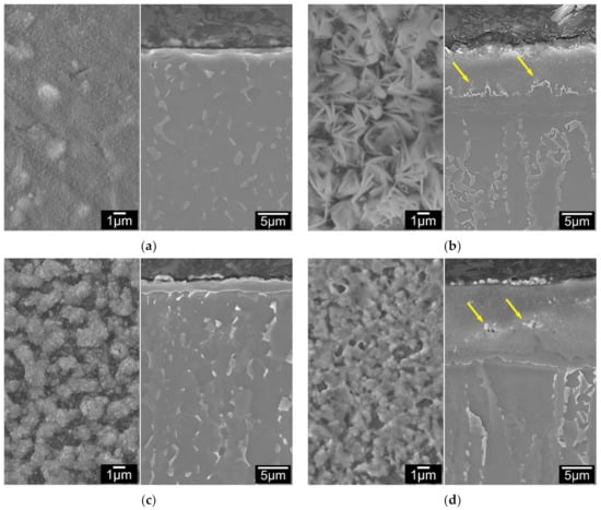 Coupons with pre-deposited coatings of Ag, Pd and Ag/Pd were ceramic conversion treated at 660 °C for 5 h with the uncoated coupons for comparison. Figure 3a–d show the SEM images of these treated samples, where the left images are of surface morphology and right are of cross-section surface layer structures. It reveals that the 660 °C 5 h treated C2T sample was covered by a smooth and fine roundish shaped oxide (Figure 3a left). The surface morphology of the C3T samples presented different features depending on pre-coating element. For Ag pre-coated samples, the oxides presented in bunches of acicular grains (Figure 3b left). When Pd was pre-coated, the sample surface was covered by clusters of fine grains (200–300 nm) after the treatment (Figure 3c left). While for Ag and Pd co-deposited samples, oxides were shaped in micro-grains with a few thin needles (Figure 3d left). Corresponding cross-sectional microstructures of these four samples show a formed surface oxide layer in the thickness of 1.21, 11.40, 2.10 and 14.60 µm for C2T, C3TAg, C3TPd and C3TAgPd samples, respectively. For Ag and Ag + Pd pre-coated coupons, white contrasted particles (corresponding to the surface granular grains) are present on the outermost surface (Figure 3b,d) and some are imbedded within the oxide layer, as denoted by arrows. Surface roughness of the samples are varying from 0.082, 0.278, 0.090 to 0.349 µm for C2T, C3TAg, C3TPd and C3TPdAg samples, respectively.