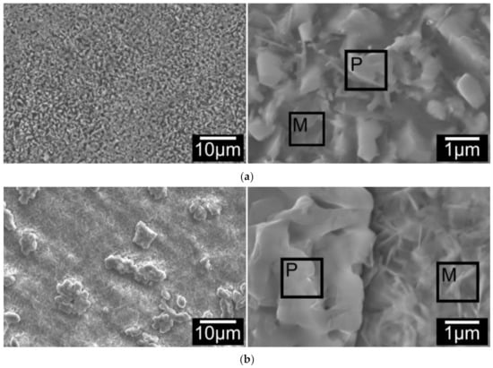 Further TEM observation and SAD pattern analysis specified the phase composition of the oxide layer structures. As can be seen from Figure 7a, the surface oxide layer consists of a topmost layer with granular and acicular grains and a dominant columnar structured sublayer. It was observed that just beneath the topmost catalytic layer an approximately 500 nm thickness layer is present, with a nano-crystalline structure (50–100 nm diameter). Beneath this nano-grained layer, the columnar structure is evident and developed to the front of the substrate with column widths of approximately 100–200 nm and lengths of approximately 400–600 nm.
