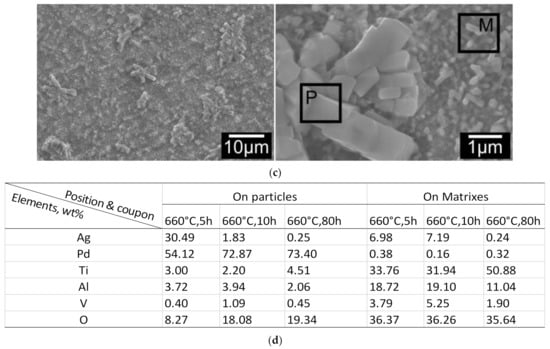 Surface morphology change of C3TAgPd coupons, treated at 660 °C for (a) 5 h; (b) 10 h and (c) 80 h. ‘P’ and ‘M’ denote particle and matrix, respectively; (d) elemental analysis on the spots of agglomerated particles and matrix grains for 5, 10 and 80 h treated coupons (see denoted P and M in a,b,c).