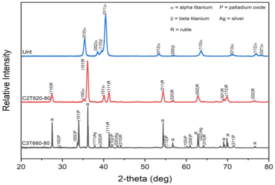 XRD patterns of as-received (Unt), C2T620-80 and C3T660-80PdAg samples.