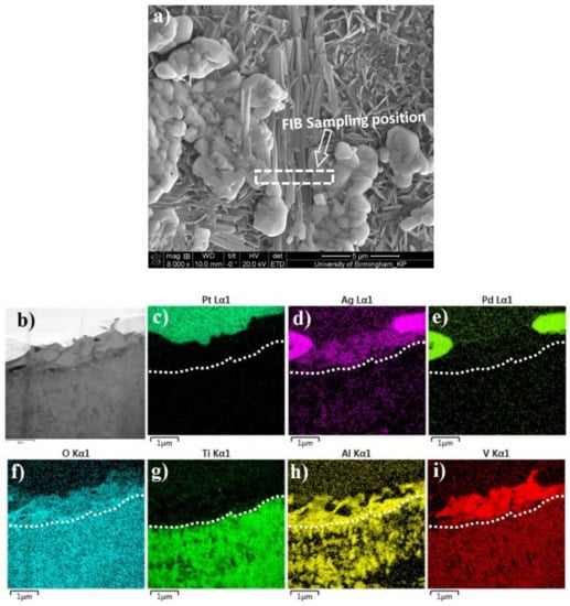 Further TEM characterisation was carried out on a C3T660-10PdAg coupon. A cross-section TEM sample was prepared by FIB, and the sampling position is across the agglomerated Pd (Ag) particle and the acicular matrix, as shown in Figure 6a. A STEM HAADF image and corresponding EDX elemental mappings of the TEM sample are shown in Figure 6b–i, which reveal cross-sectional surface oxide layer structures as shown by chemical composition distributions. An added dashed line on each element mapped image indicates the boundary between the topmost ‘catalytic‘ layer and the dominant TiO2 layer beneath. Combining the top morphology of the FIB sampling position (Figure 6a) with the cross-sectional view of the HDDF STEM image Figure 6b) and the EDX elemental mappings, it can be determined that: above the dashed line, the white contrasted grains at either side of the image (Figure 6b) are the agglomerated granular grains, and the grey middle area are acicular grains. EDX mappings show high intensities of Ag, Pd and O elements within the granular grains, while the needle shaped grains are indicating a composition of V, Ag, O, Al and Ti (trace). Interestingly, Al combined with O presented along the grain boundaries of the granular and acicular grains of the topmost layer. Beneath the topmost layer, compositional elements of alloy Ti-6Al-4V, Ti, Al, V, are all presented with O, Ag and Pd (low contrast).