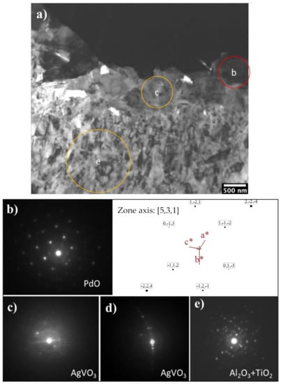 Indexing the SAD patterns of the acicular grains identified an AgVO3 (JCPDS 0029-1152) phase (Figure 7a,c,d). Faint diffraction rings were always superimposed in the Pd(Ag)O and AgVO3 patterns, which could be contributed to an amorphous or poorly crystalline structure of aluminium oxide based on the fact that Al was presented among the grain boundaries of these grains, as seen from the EDX mapping in Figure 6h, but it is difficult to identify the Al2O3 phase from the SAD patterns taken in these areas.
