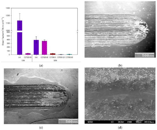 (a) Wear factors of Untreated, C2T and typical C3T coupons; SEM images of the wear tracks after 50 N wear tests for the coupons of (b) untreated; (c) C2T620-80 and (d) C3T660-5PdAg.
