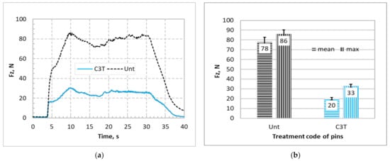 Comparisons of (a) recorded insertion forces against drilling time and (b) average and maximum insertion forces for untreated and C3T660-5PdAg treated self-drilling/self-tapping pins inserting into SAWBONES® cortical bone plates.
