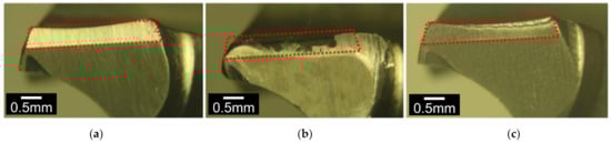 Optical images of cutting-edge areas of the pins: (a) as received new pin, (b) untreated, and (c) C3T660-5PdAg treated pins after insertion test with SAWBONES® cortical bone plates.
