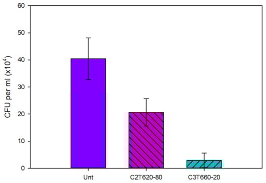 A further reduction in the number of CFU per ml was found with C3T. Where compared with Unt, there was a 93% reduction, and when compared with C2T, an 85% reduction. This is since it has silver present on the surface, which is well known for its antimicrobial activity. This is thought to be from hindering metabolism and DNA replication of the bacterial cells, ultimately resulting in cell death. [13,14,32,33]